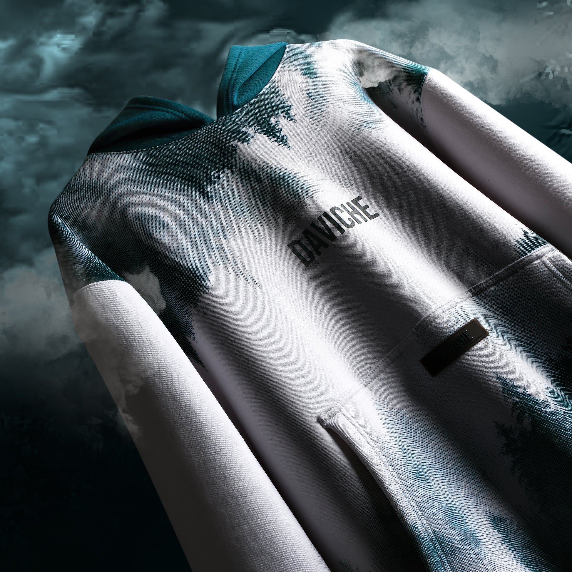 Discover the allure of nature with the DAVICHE Mystic Peaks Hoodie. This unique piece showcases stunning CMYK prints of the trees shrouded in a delicate fog, expertly displayed on both the front and back. The intricate design captures the serene beauty of the wilderness, merging artistry with streetwear flair. A DAVICHE logo on the center front is screen printed. A distinct black DAVICHE patch is expertly stitched onto the pocket, serving as a signature element that highlights the brand’s identity. Crafted from high-quality fabric,this hoodie offers exceptional comfort and durability, making it perfect for everyday wear or outdoor adventures. The relaxed fit provides freedom of movement, while the vibrant prints ensure you stand out in any crowd. Ideal for those who appreciate the splendor of nature.